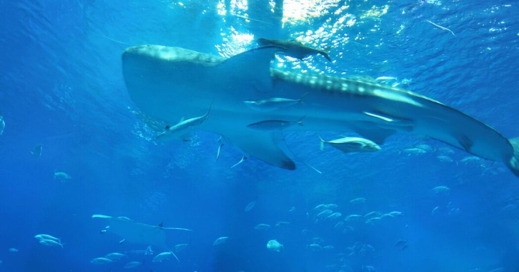 他ではなかなか見ることのできない、視界一面に広がるジンベイザメの水槽はとても幻想的。
