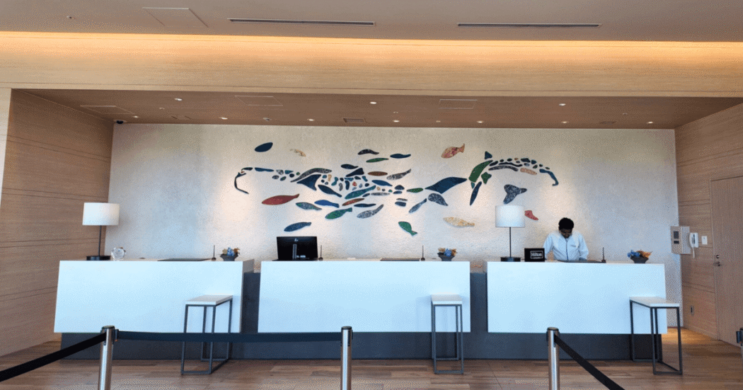 ロビーの開放的な窓からも沖縄の海が一望でき、チェックイン待ちからワクワク!