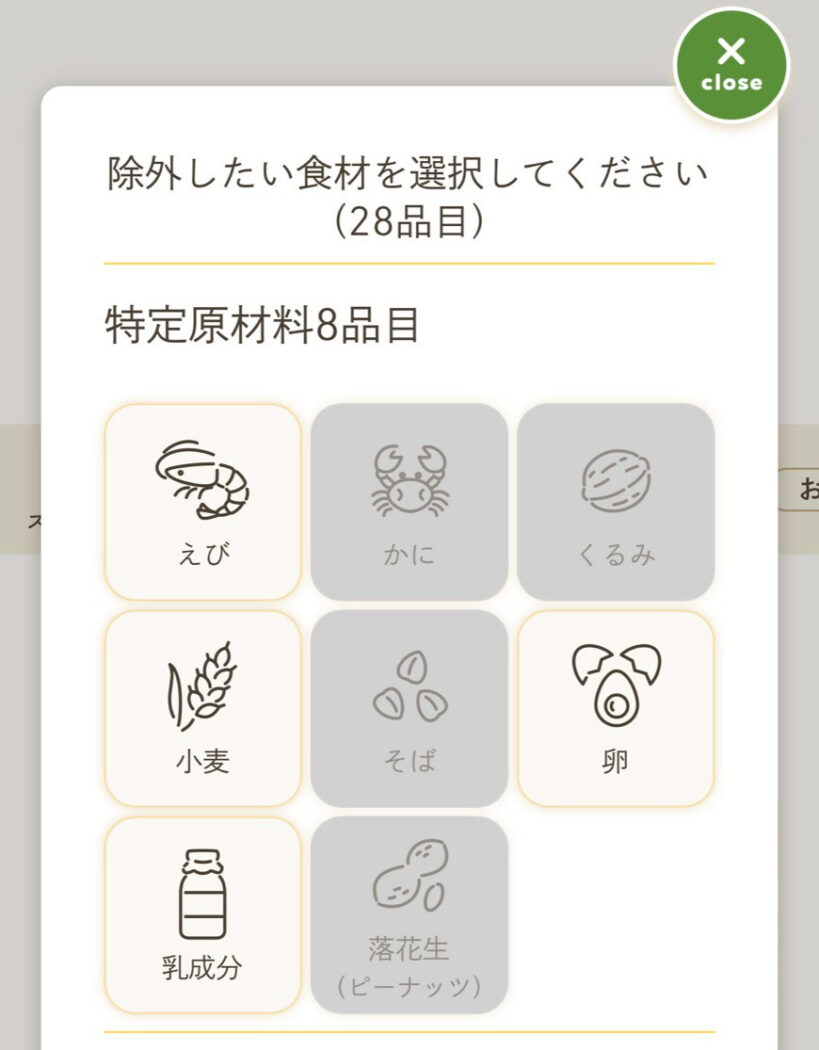 商品一覧では除外したい食材を選択することができるので、アレルギーがある場合でも成分をいちいちチェックする必要なく簡単に選びやすいです。