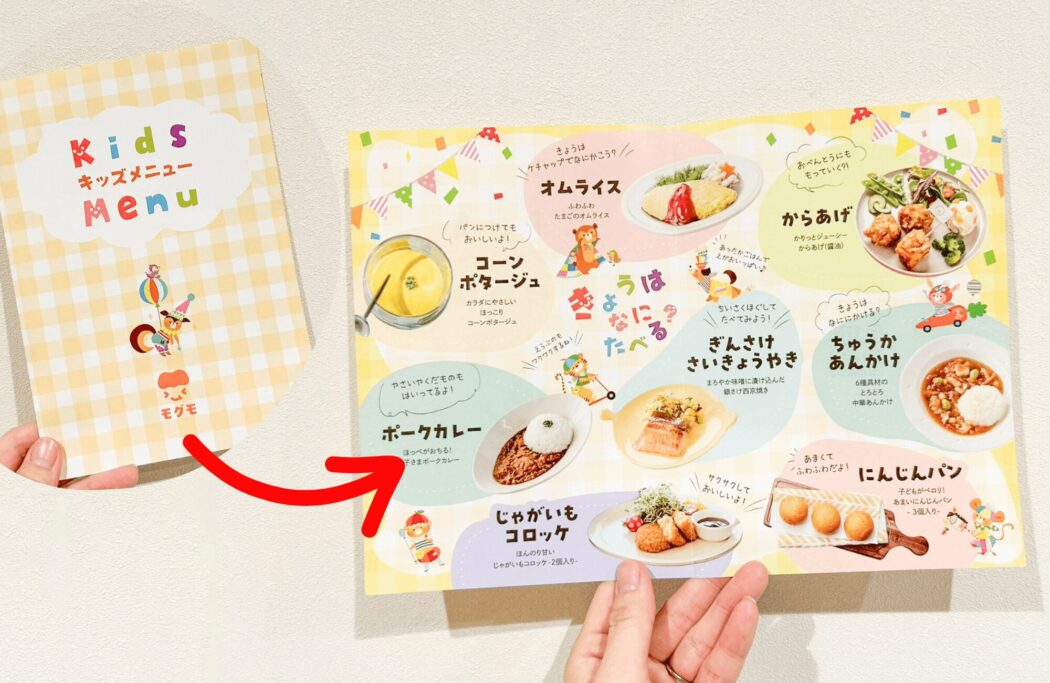 さらに、商品以外にはレストランごっこができるキッズメニューやもぐもぐチャレンジシートも入っています。