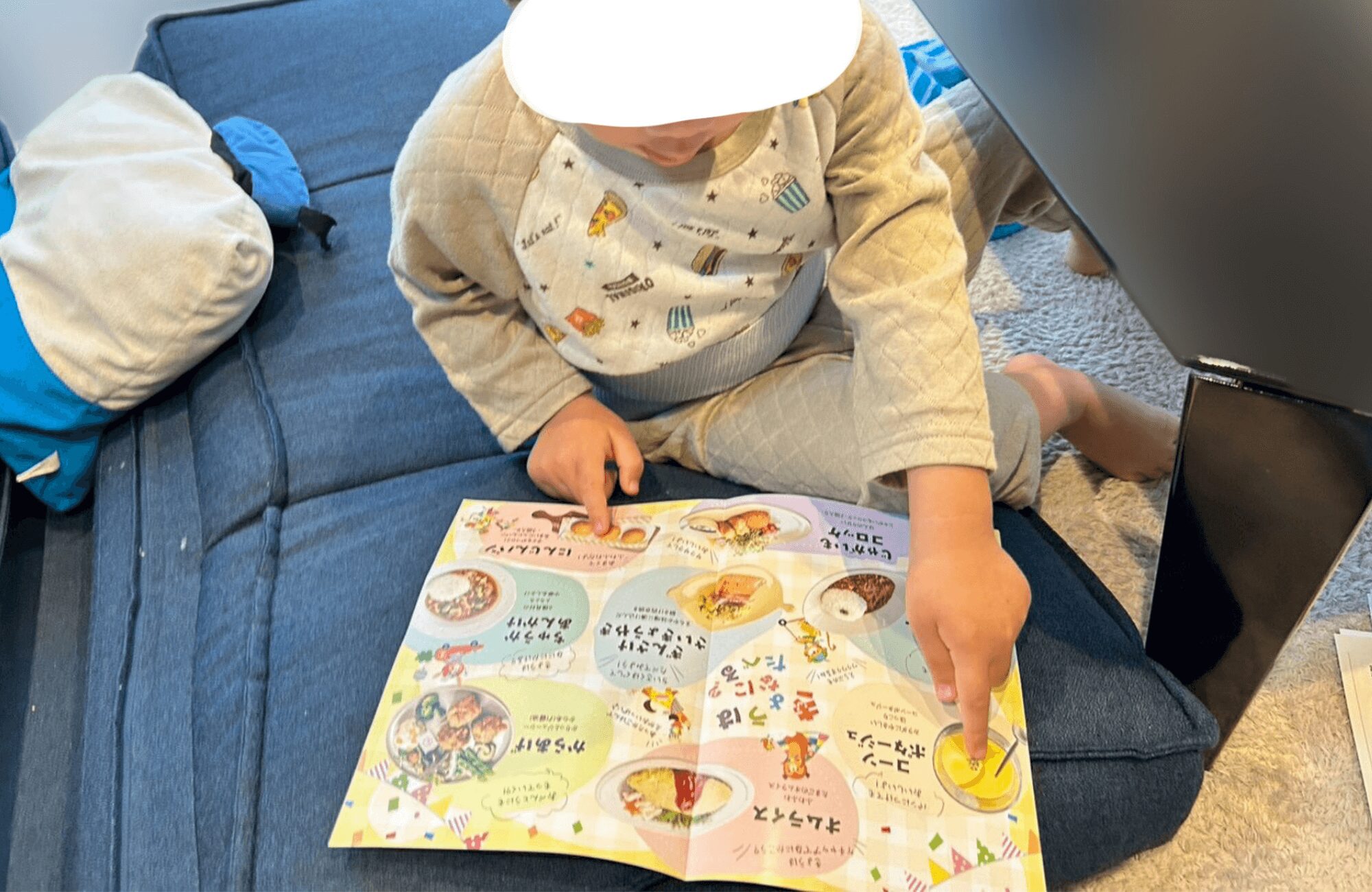 初日の1品目をキッズメニューで選んでもらおうとしたところ、最初は興味をもったものの、メニュー選びはコーンスープ以外いらないと言われ我が子には不発に…