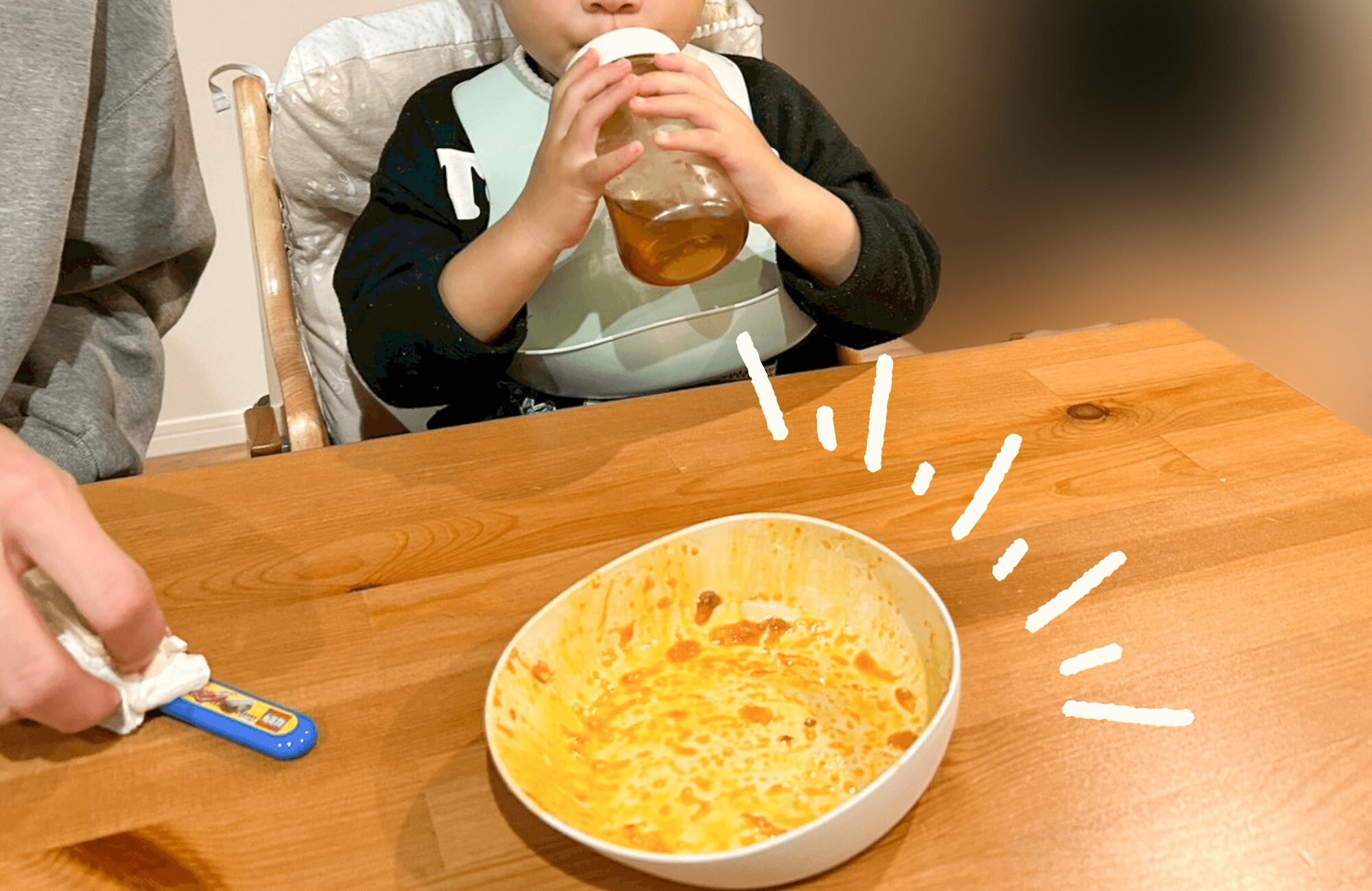 ![]() ほっこりコーンポタージュ | 完食! | 濃厚で甘味のあるコーンスープ。 一気飲みで、「追加がほしい!」と怒るほど気に入った様子。 |